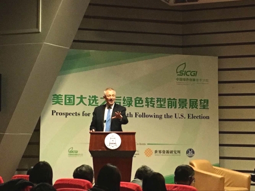 12月9日,中國綠色創(chuàng)新夏季學(xué)院專題論壇“美國大選之后的綠色轉(zhuǎn)型前景展望”在清華大學(xué)公共管理學(xué)院舉辦。世界資源研究所主席兼首席執(zhí)行官安德魯·斯蒂爾發(fā)表主題演講,安德魯·斯蒂爾博士是世界資源研究所主席兼首席執(zhí)行官,環(huán)保部中國環(huán)境與發(fā)展合作委員會的特派外方顧問委員,曾歷任世界銀行環(huán)境局局長、氣侯策略基金聯(lián)合主席,英國國際發(fā)展部主任等職位。他從政治、經(jīng)濟(jì)、全球影響等角度分析了美國候選總統(tǒng)特朗普上臺之后,將會給全球綠色轉(zhuǎn)型帶來怎樣的影響。