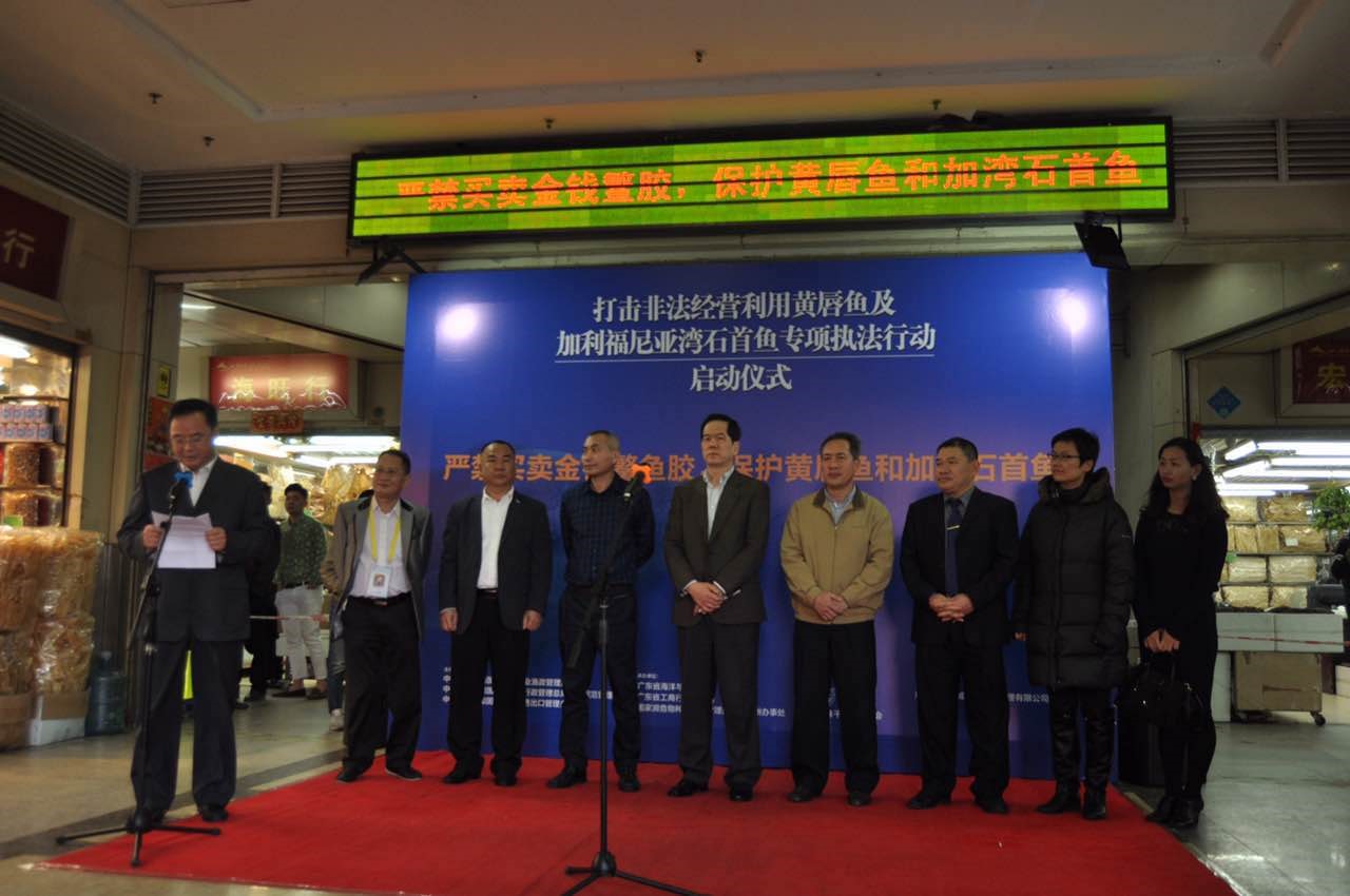2017年1月9日,中華人民共和國農(nóng)業(yè)部漁業(yè)漁政管理局、工商總局市場規(guī)范管理司和瀕危物種進出口管理辦公室(以下簡稱國家瀕危辦)聯(lián)合在廣州舉辦“打擊非法經(jīng)營利用黃唇魚及加利福尼亞灣石首魚專項執(zhí)法行動”啟動儀式,開啟了為期一個月的針對非法經(jīng)營利用黃唇魚及加灣石首魚魚鰾(市場名:金錢鳘魚膠)的市場清查與宣傳教育活動。廣東省工商、漁政管理部門、國家瀕管辦廣州辦事處、廣州海關以及野生救援、自然資源保護協(xié)會、阿里巴巴、騰訊和廣州市海味干果行業(yè)商會等代表參加了啟動儀式。